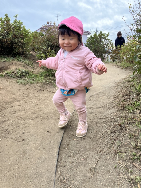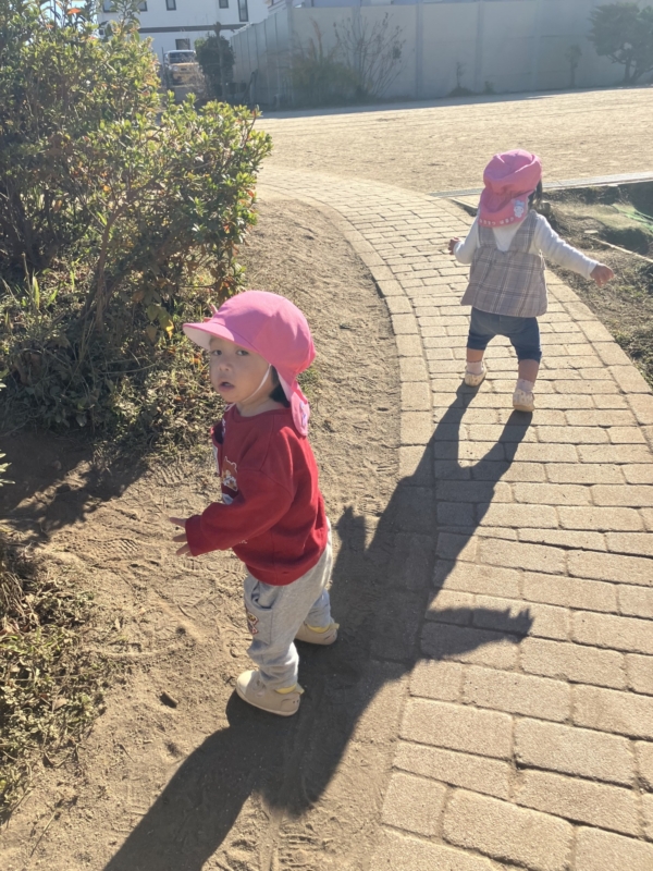 上着を着て0歳児クラスの子どもたちも元気に園庭を散策しています!