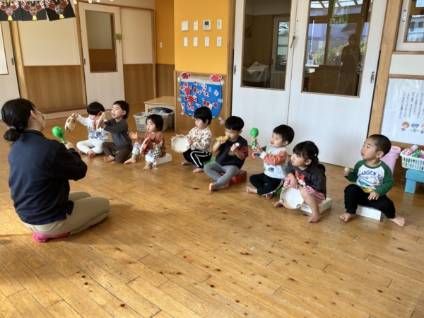 音楽遊びでは、音やリズムを楽しみながら表現する姿が見られ、