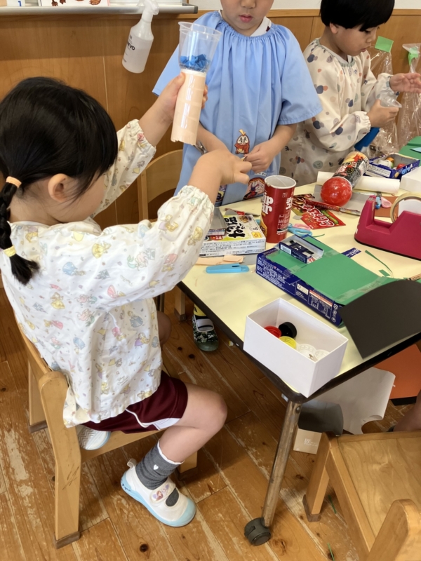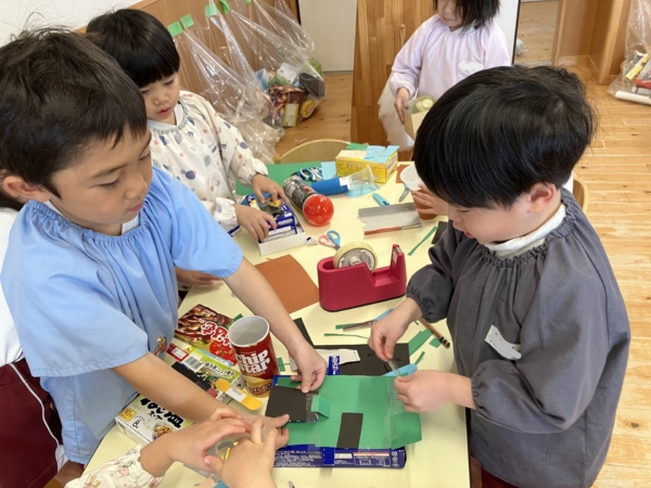 毎日の廃材遊びで、たくさんのアイデア・発見が生まれたり、お友達同士で交流しながら製作できることに子どもたちもワクワクしているようです♪