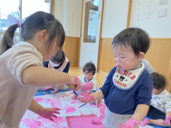 つつじ組さんで絵の具遊びをした時の様子です。