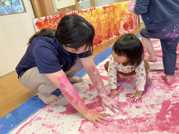 お友達と一緒に、保育者と一緒に全身で絵の具遊びを楽しみました。